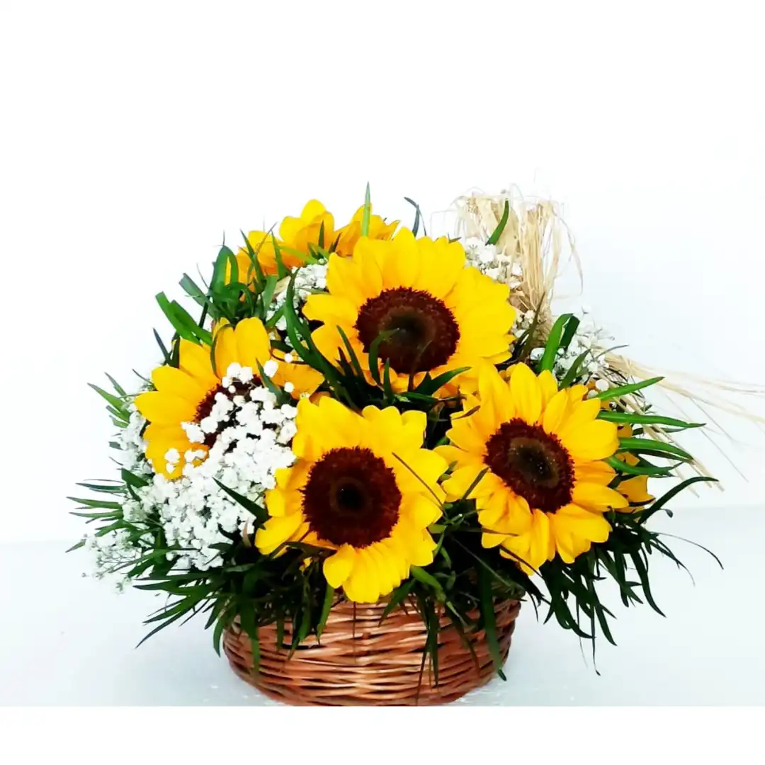 Hermoso Canasto de mimbre con 8 Girasoles