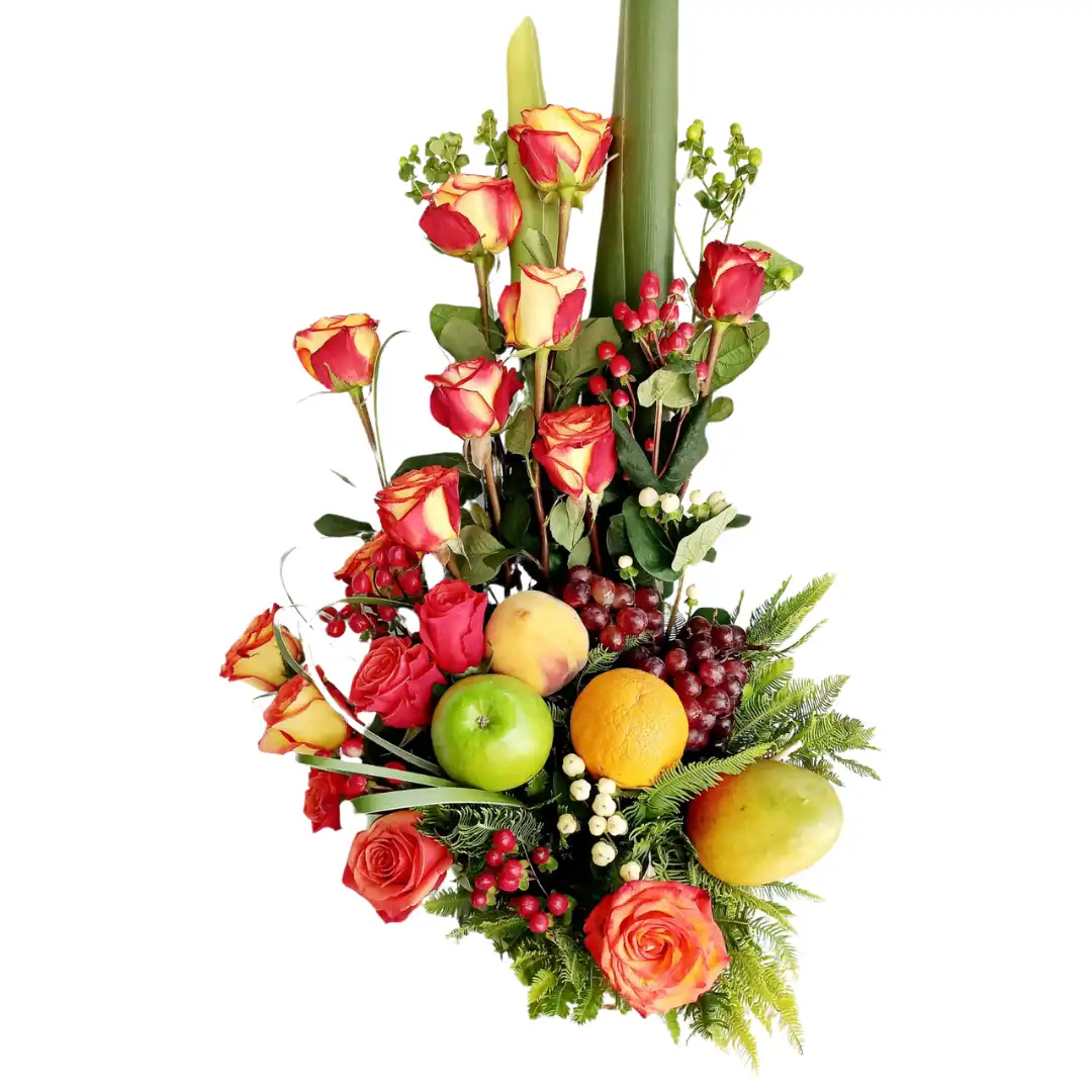Bello arreglo Floral con deliciosas y frescas frutas de la estación