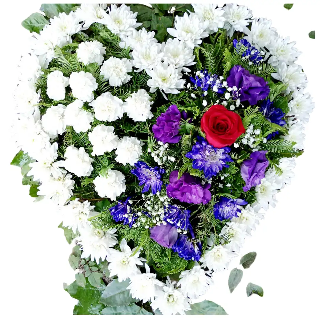 Corona en forma de Corazón con Flores de estación en tonos morados y Rosados.