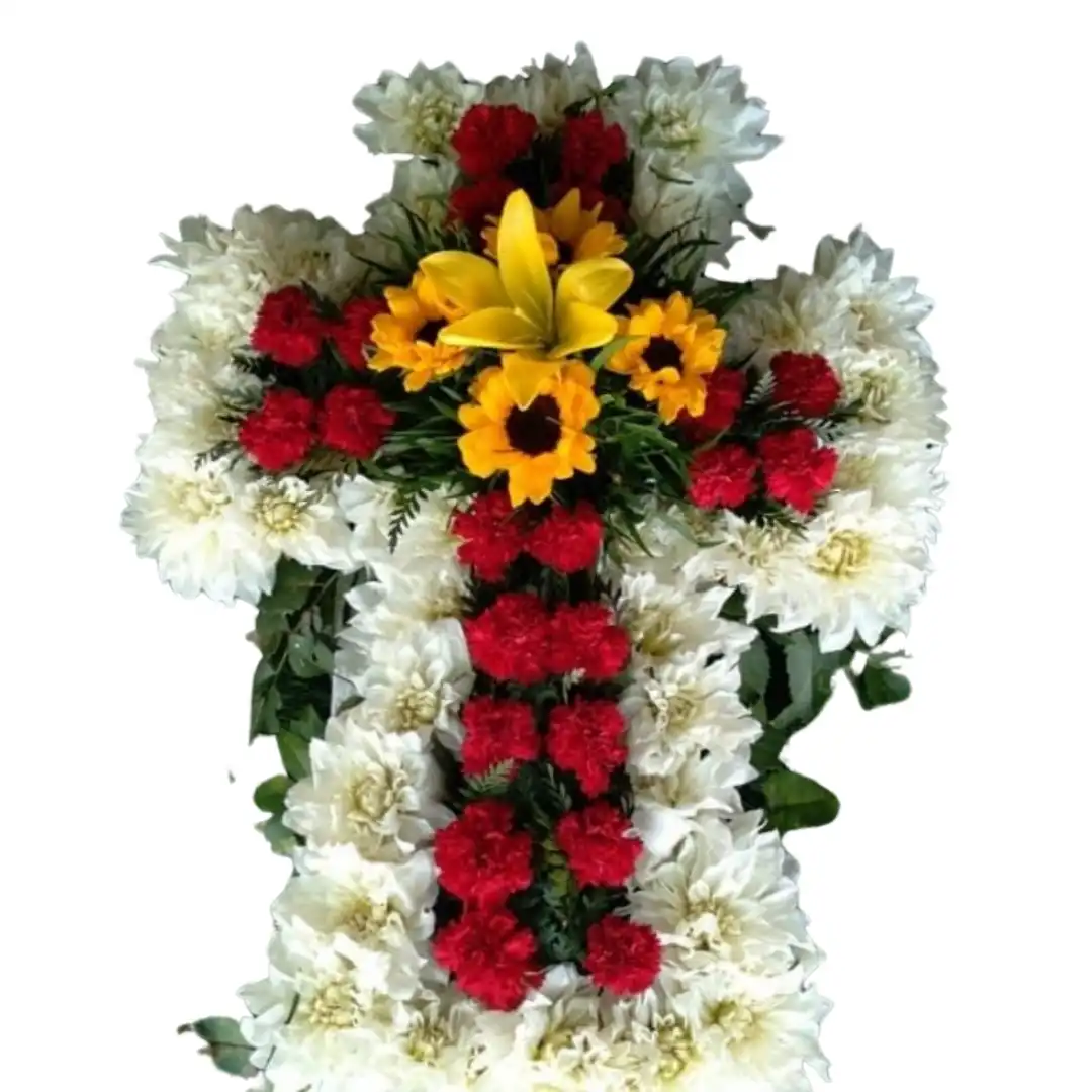 Corona en forma cruz con Flores de estación Blancas y Rojas