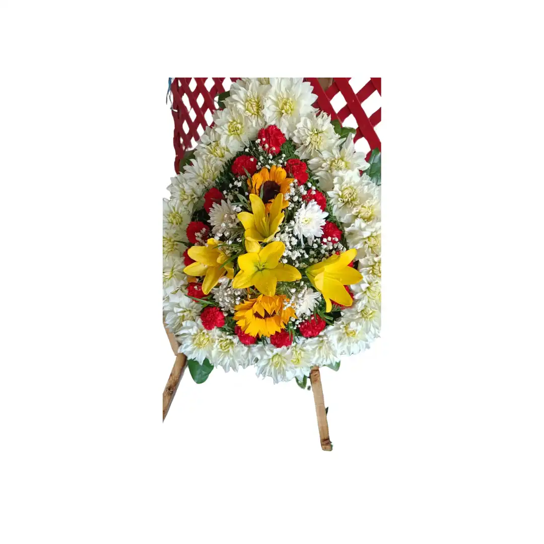 Corona en forma de lagrima de Flores de estación y Rosas Rojas.